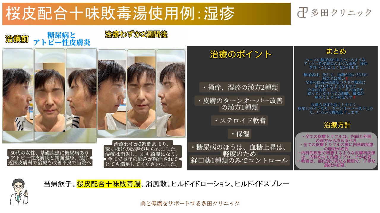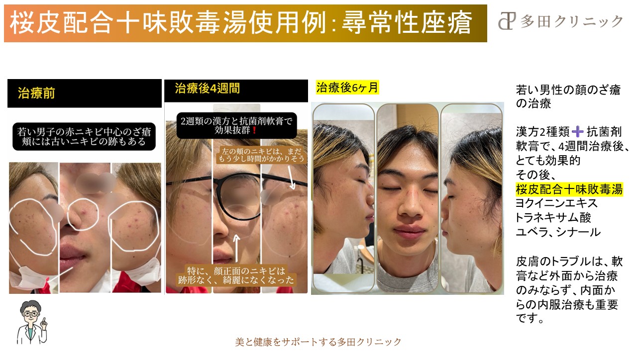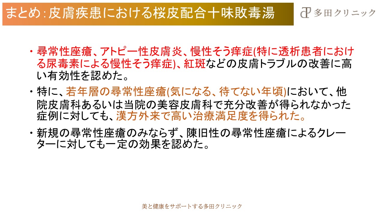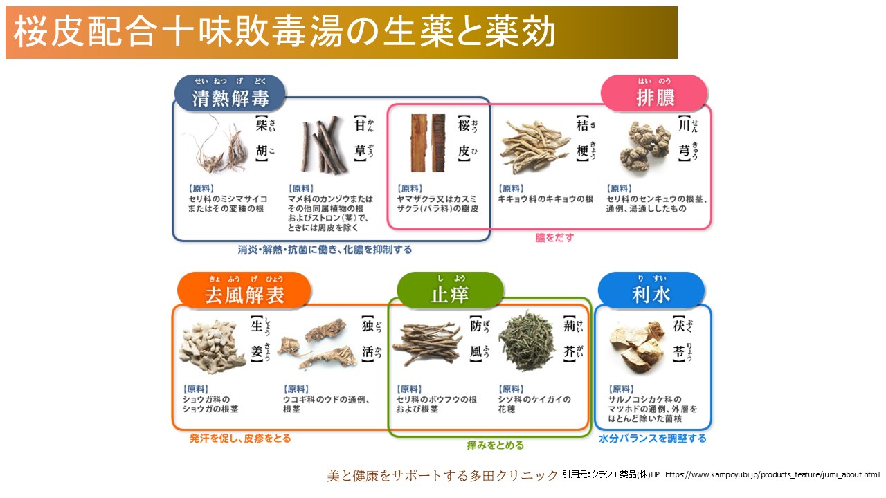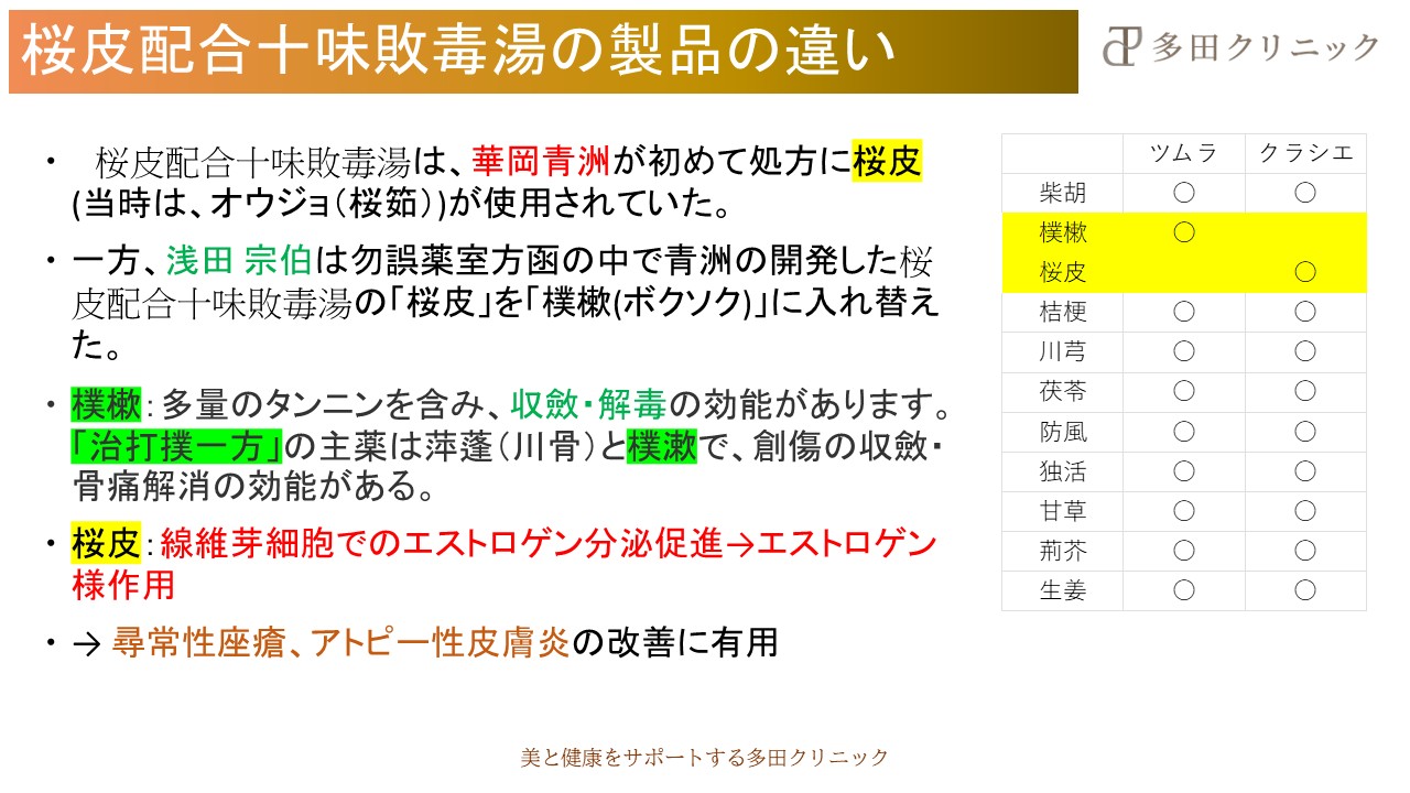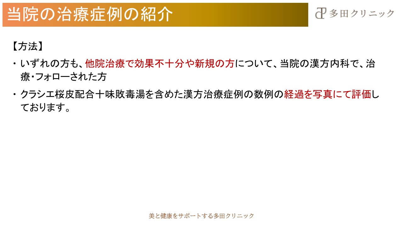 桜皮は、エストロゲン様作用があり、十味敗毒湯は、10種類の生薬の配合で、ニキビ、アトピー性皮膚炎など慢性皮膚炎、慢性湿疹、慢性そう痒症に有効です。症例を写真にて紹介しました。