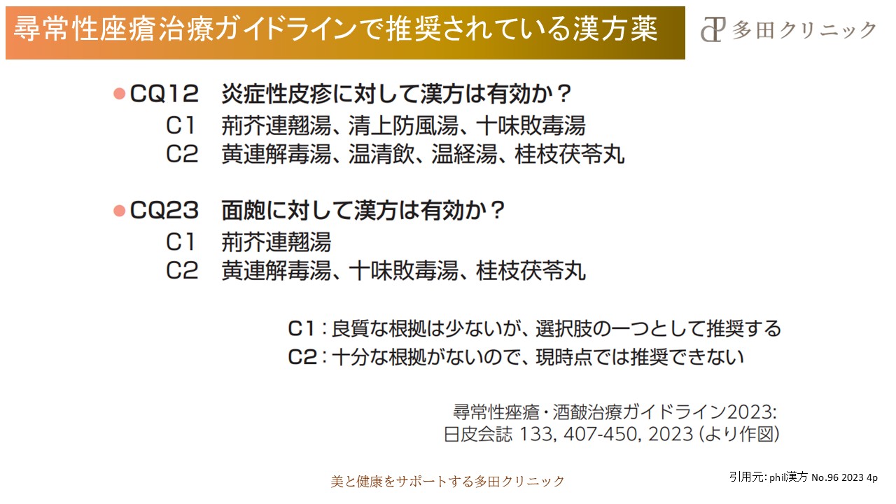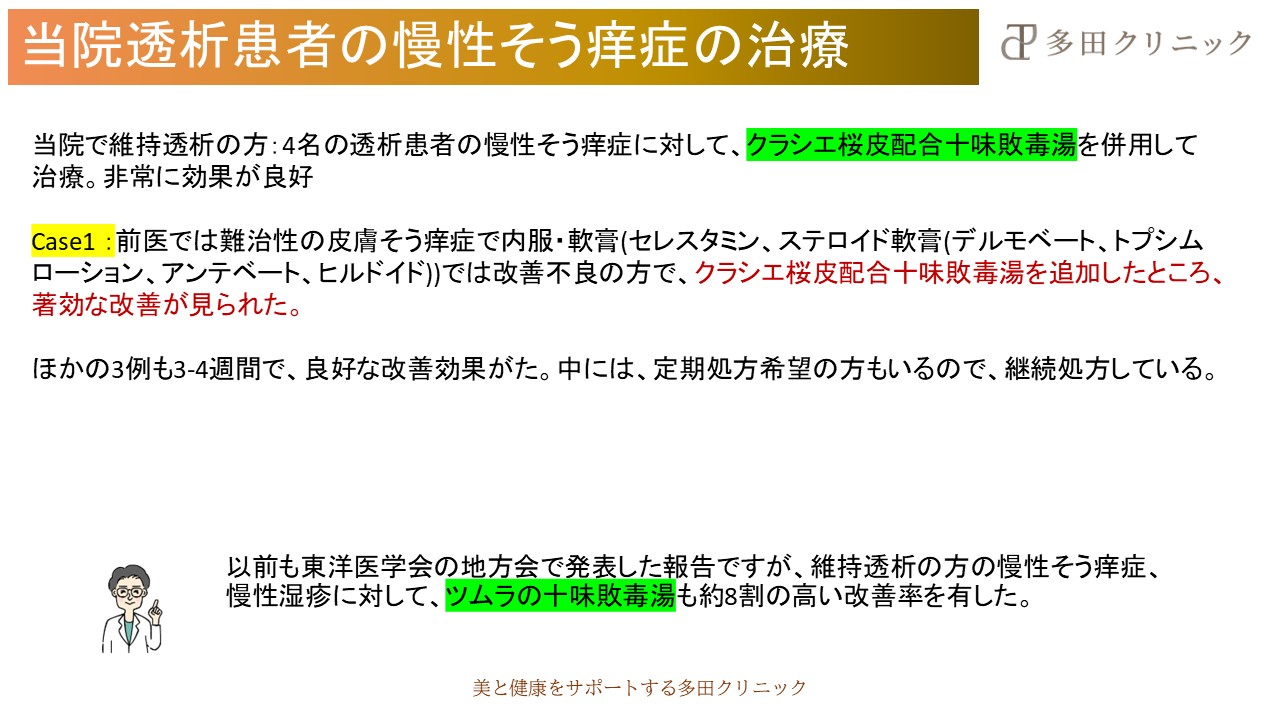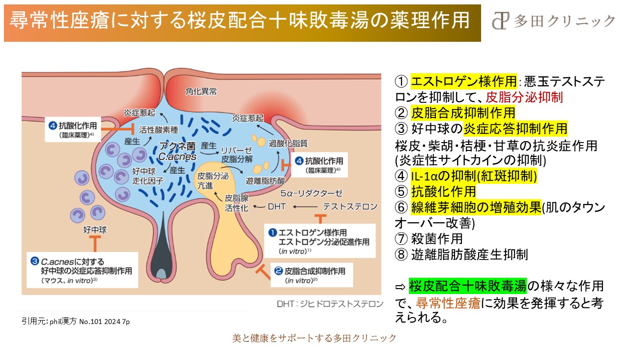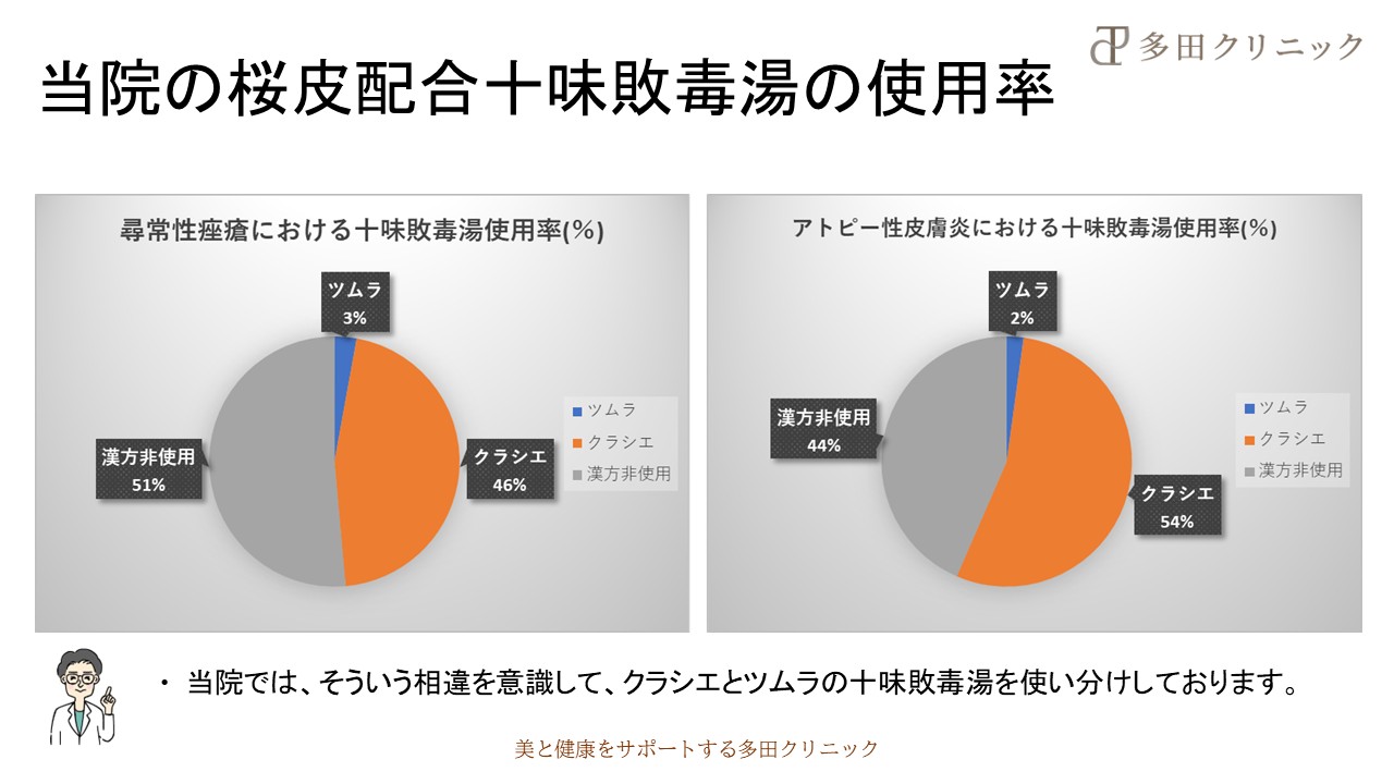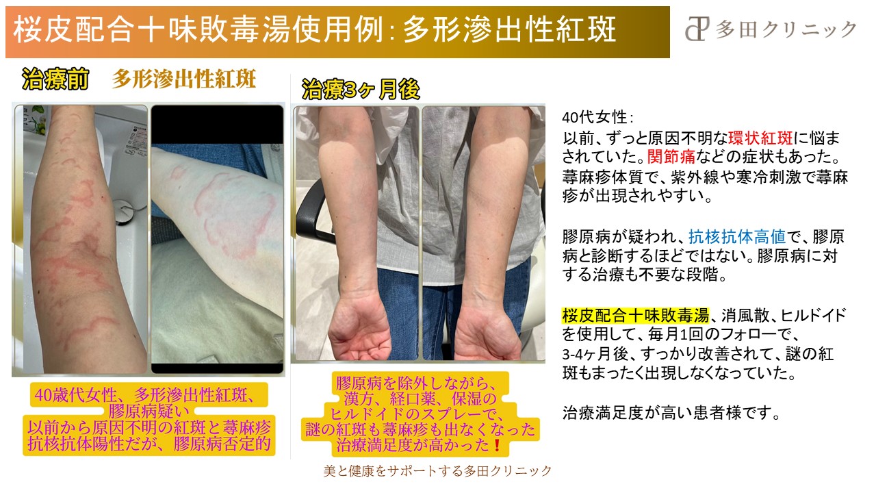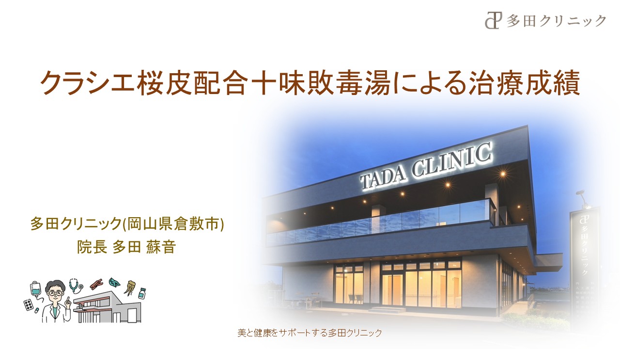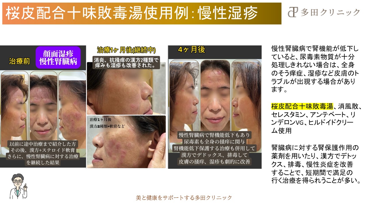 桜皮は、エストロゲン様作用があり、十味敗毒湯は、10種類の生薬の配合で、ニキビ、アトピー性皮膚炎など慢性皮膚炎、慢性湿疹、慢性そう痒症に有効です。症例を写真にて紹介しました。