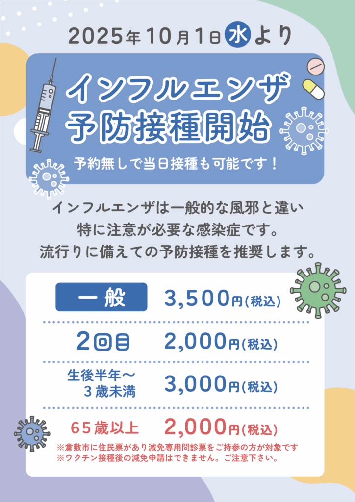 今年は、インフルエンザAが大流行。学生さん、受験生、医療関係者、基礎疾患を有する方には、強く推奨しております。早めに接種して、インフルエンザから防御していきましょう。